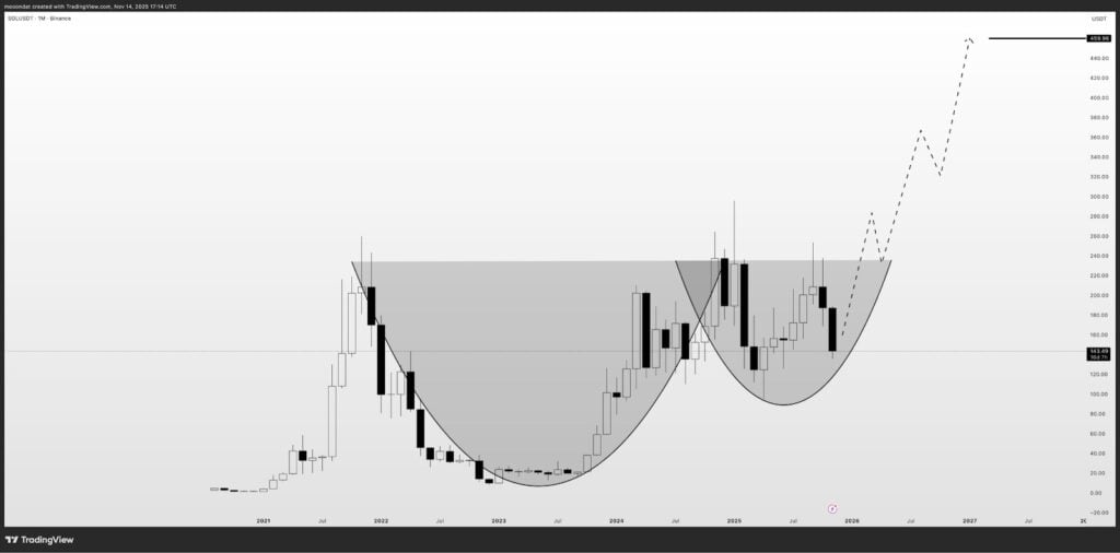 A widely known analyst, Ray, who has greater than 190k followers on X, shared a easy Solana value prediction. The goal sits at $500, and the analyst posted a chart displaying a big cup-and-handle sample forming on the upper timeframe.