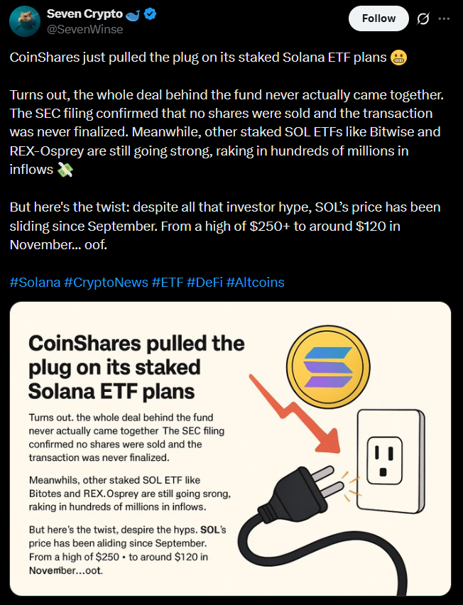 • CoinShares withdrew its staked Solana ETF software after the underlying structuring deal fell aside.