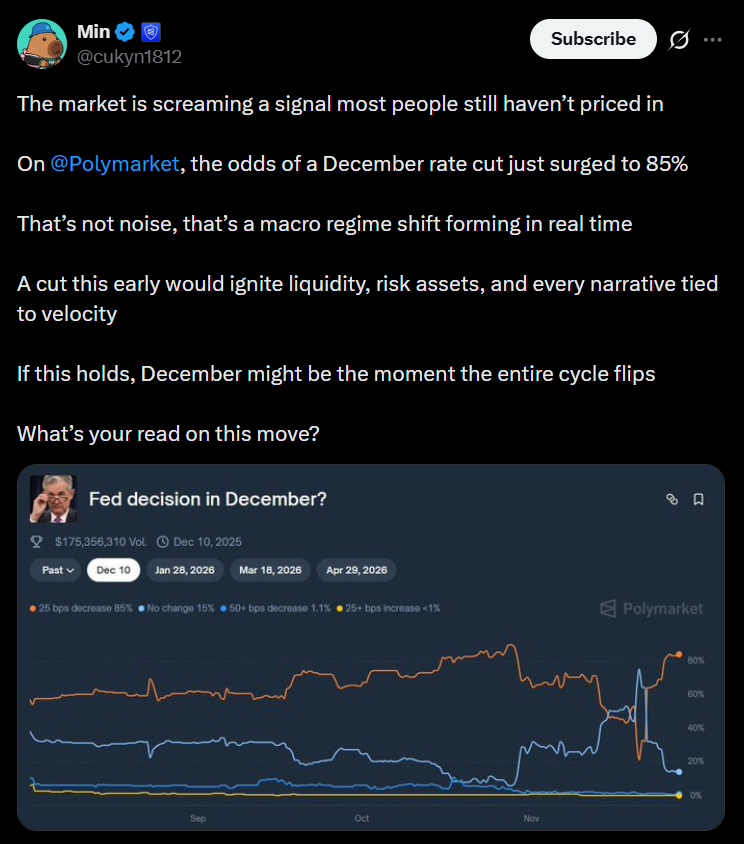 JPMorgan has abruptly reversed its earlier stance, now forecasting that the Federal Reserve will reduce rates of interest by 0.25% on the December 10 assembly. It is a sharp departure from weeks of messaging suggesting the Fed would delay till January. The shift comes simply as a number of Fed officers have grown extra open to easing sooner, particularly amid cooling labor circumstances. With odds climbing again towards 85%, markets are rapidly adapting to the renewed risk of a December coverage shift.