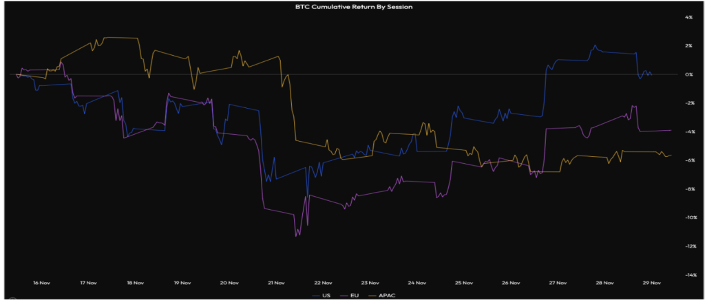 However, Asia continues to lag behind each areas. Velo’s chart reveals that the APAC buying and selling session, represented by the yellow line, began in barely optimistic territory round November 20 however turned unfavorable quickly after. For many of the week, the areas remained between -5% and -7%. This persistent weak point indicators a continuation of the year-long sample by which Asian hours have been the main driver of Bitcoin’s sell-side stress.