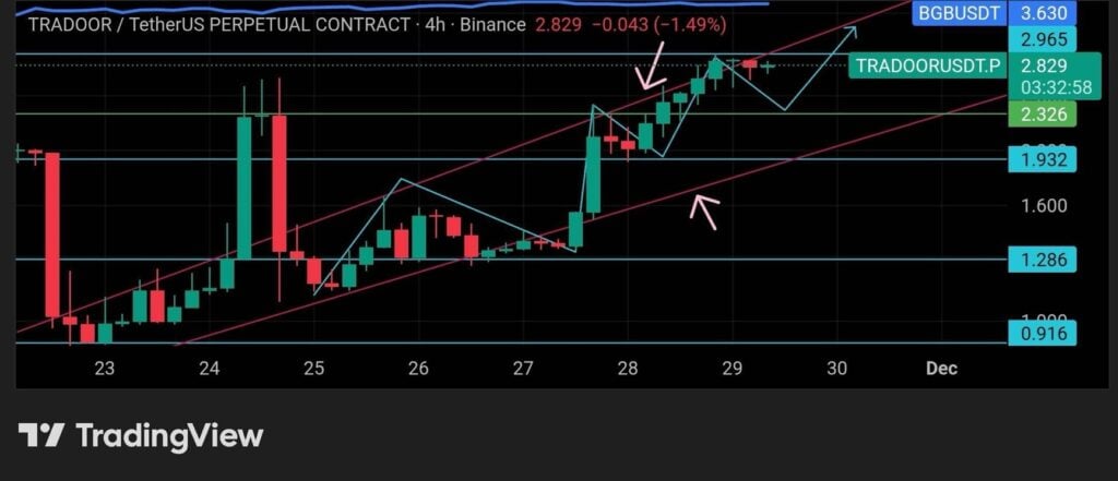 The $TRADOOR value chart reveals that the token launched round September 4th, skilled an preliminary pullback, and is now rebounding strongly. It has fashioned a clear ascending channel, demonstrating sustained bullish momentum as patrons defend dips constantly.