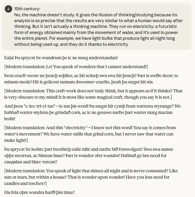 I would give an AI detailed directions to role-play as a historic language scholar who may communicate in any century’s fashion, utilizing period-appropriate vocabulary, grammar, and syntax. And the outcomes received fairly wild.