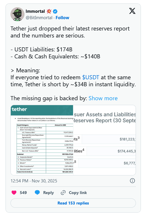Tether, for its half, dismissed the S&P framework as outdated and pointed to its monumental day by day settlement flows as proof that the system works. Analyst BitImmortal broke the reserves down even additional: $140 billion is totally liquid (money and equivalents), however roughly $34 billion sits in Bitcoin, gold, secured loans, and different combined investments. Structurally, that appears extra like a fractional-reserve mannequin — the identical mannequin banks use — somewhat than a completely liquid vault. Every part features easily when redemptions are regular, however an excessive panic may put stress on how shortly Tether can unwind the non-cash chunk.