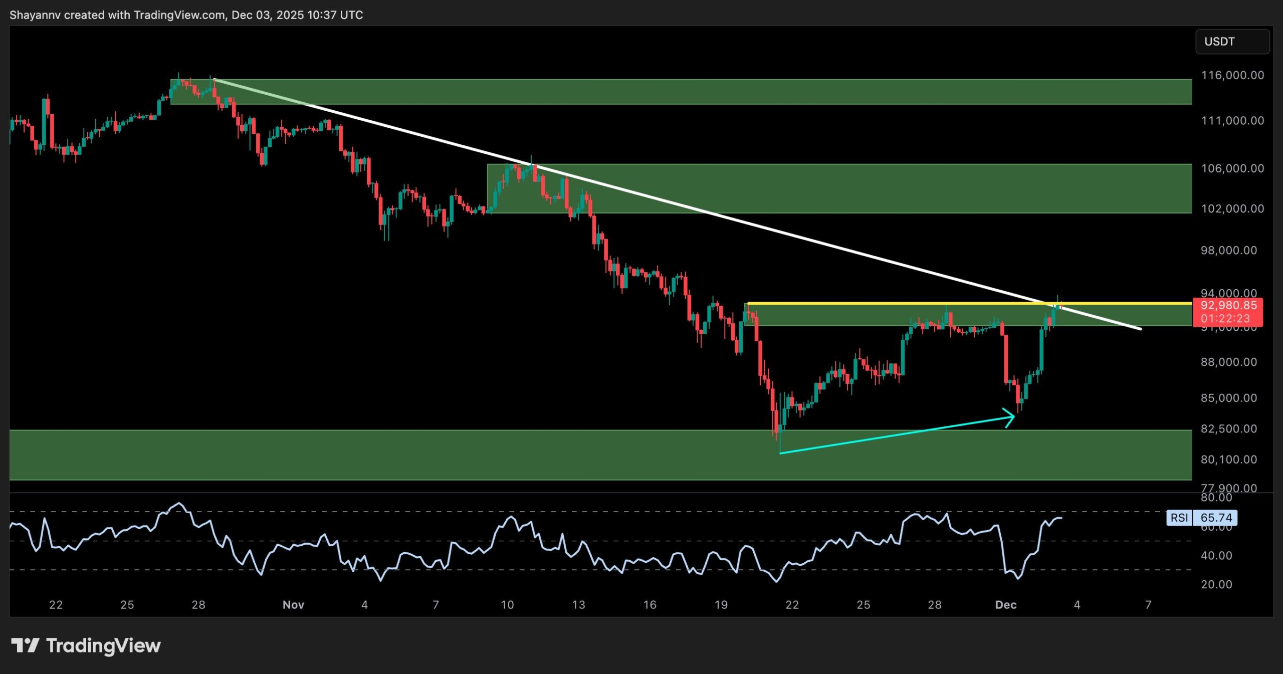 On the each day chart, BTC is reclaiming the mid-range inexperienced demand zone between $89,000 and $93,000. The value is prone to problem the higher trendline of the descending sample within the coming days, which has been performing as dynamic resistance because the breakdown from $116K.