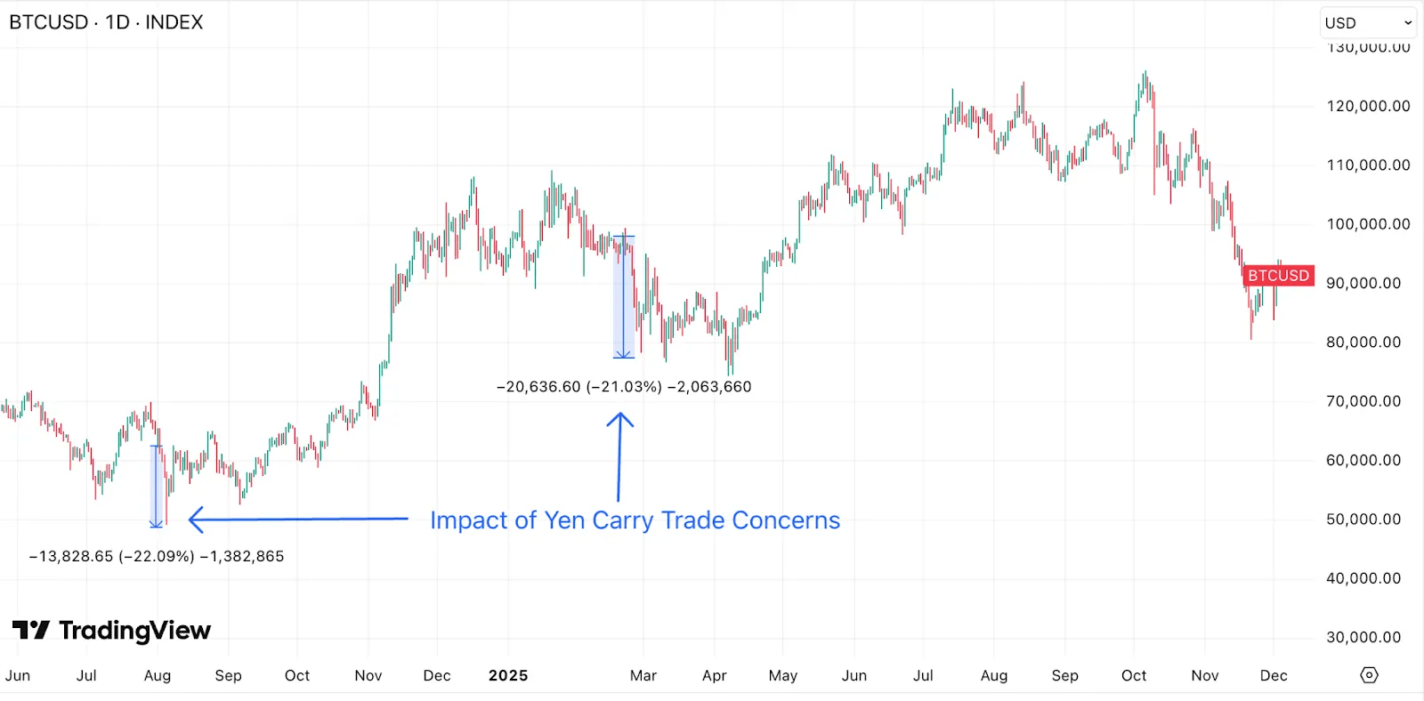 Otychenko feels this might put “the yen carry commerce”—the place merchants borrow low-cost cash from Japanese markets when their rates of interest are low to make trades—beneath stress. Otychenko factors out that in August 2024 and February 2025, Bitcoin noticed transient 20% value drops and rising ETF outflows throughout related considerations over the yen carry commerce surroundings.