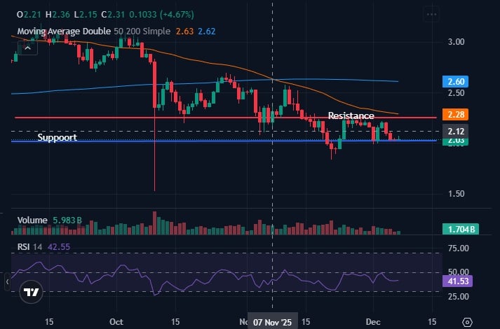 For the previous few weeks, XRP has been consolidating between its main help at $2 and resistance close to $2.25, suggesting a managed surroundings fairly than a breakdown setup. $XRP is predicted to search out help once more and make its means towards the unfilled imbalances round $2.18 to $2.20.