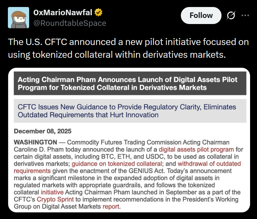 - CFTC launches a pilot permitting BTC, ETH, and USDC as collateral in US derivatives markets