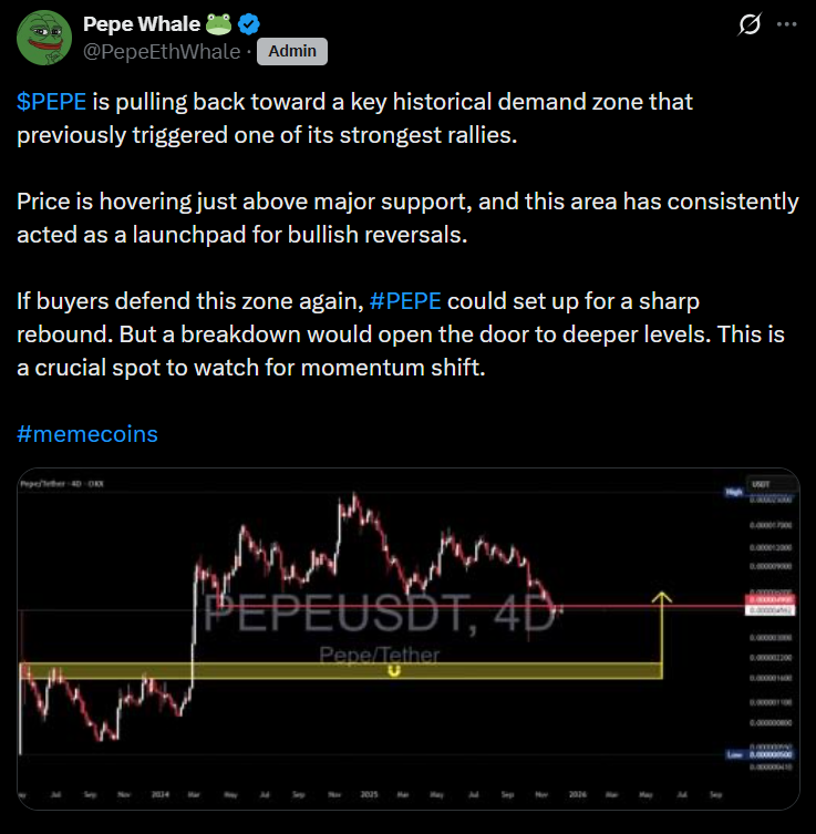 Pepe has spent the previous few months sliding additional down the market rankings, now sitting across the sixtieth spot by market cap. The token has dropped greater than 83 % since December 2024, with the broader market downturn pulling memecoins sharply decrease. Even so, PEPE has managed small beneficial properties over the previous week, suggesting that promoting stress might lastly be easing. This comes as merchants search for indicators of stability throughout the market after an October crash that delivered the biggest single-day liquidation occasion in crypto historical past.