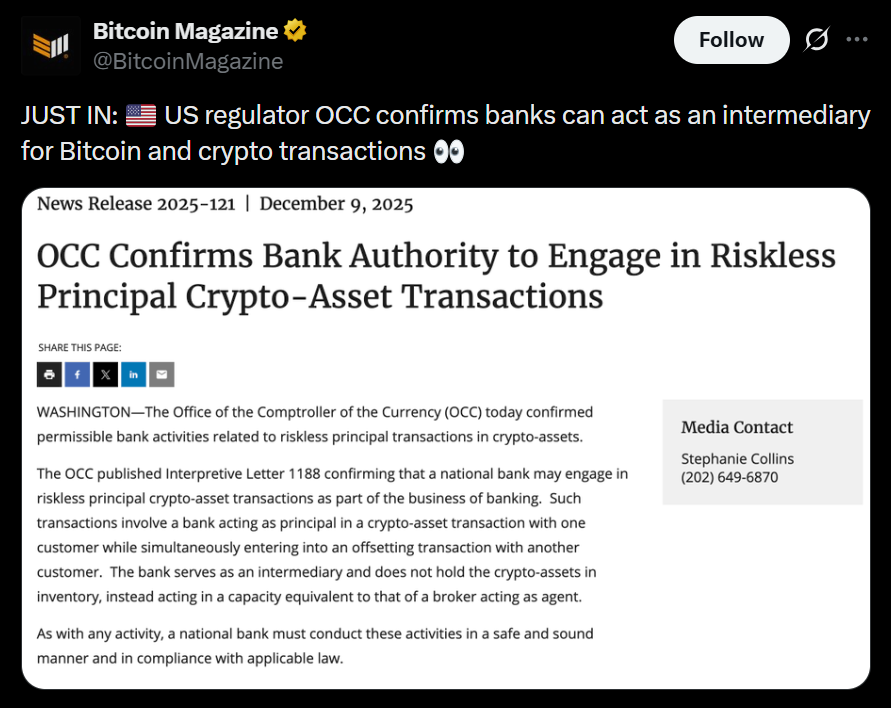 A significant shift simply landed within the U.S. banking sector. The Workplace of the Comptroller of the Foreign money has confirmed that banks can now act as intermediaries for crypto transactions via what’s often known as riskless-principal trades. In easy phrases, a financial institution can purchase crypto from one get together and instantly promote it to a different with out holding the asset on its books. This retains their publicity almost zero whereas giving them a proper function inside crypto markets that, till now, was principally off-limits.