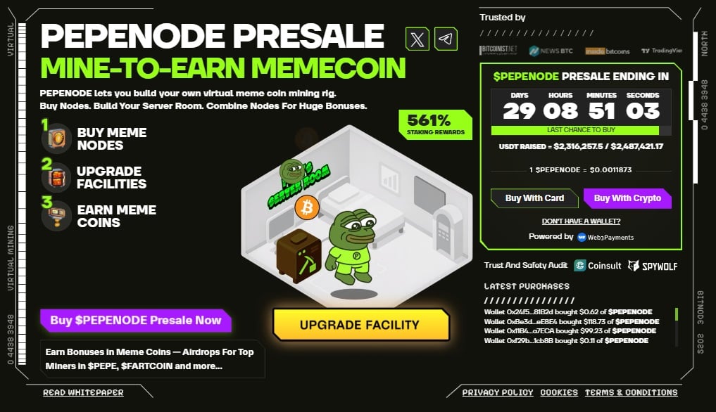 Pepenode is a crypto presale venture combining a “mine-to-earn” idea with meme coin tradition. Early supporters should purchase $PEPENODE tokens to arrange digital mining nodes, improve services, and earn meme cash, together with Pepe and Fartcoin, with further bonuses for prime miners.