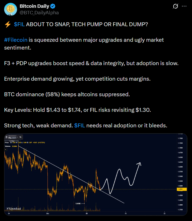Filecoin fell sharply over the previous 24 hours, sliding greater than seven p.c from 1.48 {dollars} to round 1.38 {dollars} as sellers accelerated a sector-wide decline. The decentralized storage token has been forming a transparent downtrend since its December tenth peak at 1.55 {dollars}, with decrease highs confirming sustained bearish management. Based on technical readings, buying and selling quantity surged to over ten million tokens throughout the breakdown, suggesting heavy participation as assist ranges started to offer approach.