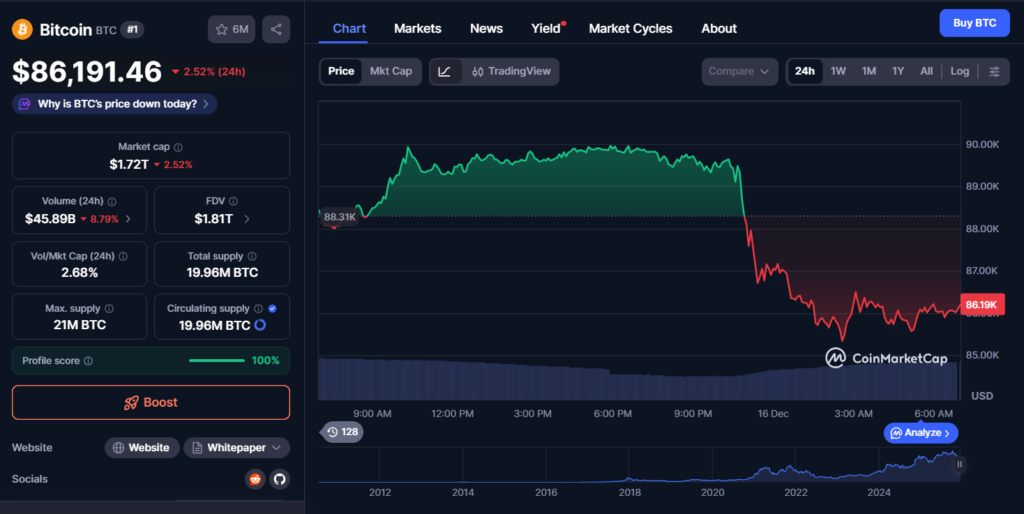 Crypto markets remained underneath strain on Monday as Bitcoin slipped to the $86,000 vary throughout U.S. afternoon buying and selling, extending losses from the weekend. The transfer got here as traders continued to digest combined macro indicators, with warning returning regardless of comparatively modest declines in conventional fairness markets. Bitcoin’s pullback pushed it beneath a variety it had held for over two weeks, elevating questions on near-term route slightly than signaling outright panic.