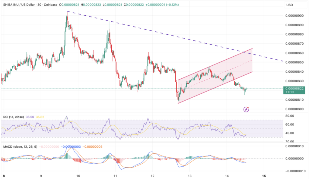 Zooming into the decrease timeframes doesn’t change the story a lot. On the 30-minute chart, SHIB briefly tried a restoration inside a small rising channel, however that construction is already breaking down. Value is drifting again towards the decrease finish of the intraday vary, suggesting the bounce didn’t have a lot energy behind it.