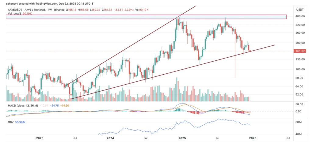 After the drop, AAVE is now sitting at a way more essential degree. On the weekly chart, worth is pulling again towards an ascending trendline that has held a number of occasions since mid-2023. Proper now, the $160–$162 zone is performing as a call space moderately than a transparent assist or resistance.