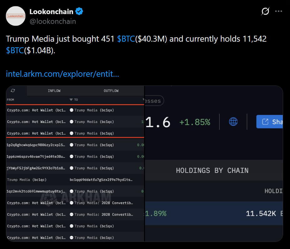 Trump Media & Expertise Group has expanded its Bitcoin publicity once more, including 451 BTC value roughly $40.3 million to its company stability sheet. In accordance with information shared by analytics agency Lookonchain, the acquisition brings the corporate’s complete Bitcoin holdings to 11,542 BTC, now valued at greater than $1.0 billion at present market costs. The transfer reinforces Trump Media’s rising id as one of many extra aggressive company adopters of Bitcoin.