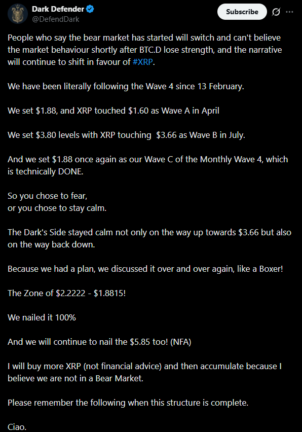 From a technical perspective, some analysts consider XRP could already be finishing a corrective part. Darkish Defender, a well-followed XRP analyst, argues that the latest drop matches neatly inside a broader wave construction moderately than signaling the beginning of a chronic bear market.