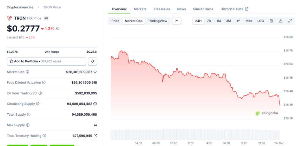 The rise in Tron’s buying and selling quantity comes as Bitcoin stays largely range-bound close to the $87,000 stage, limiting momentum throughout most crypto belongings. Regardless of the spike in derivatives exercise, TRON’s native token TRX has not but mirrored the surge in worth, buying and selling round $0.28 and down almost 2% over the previous 24 hours, in accordance with CoinGecko.