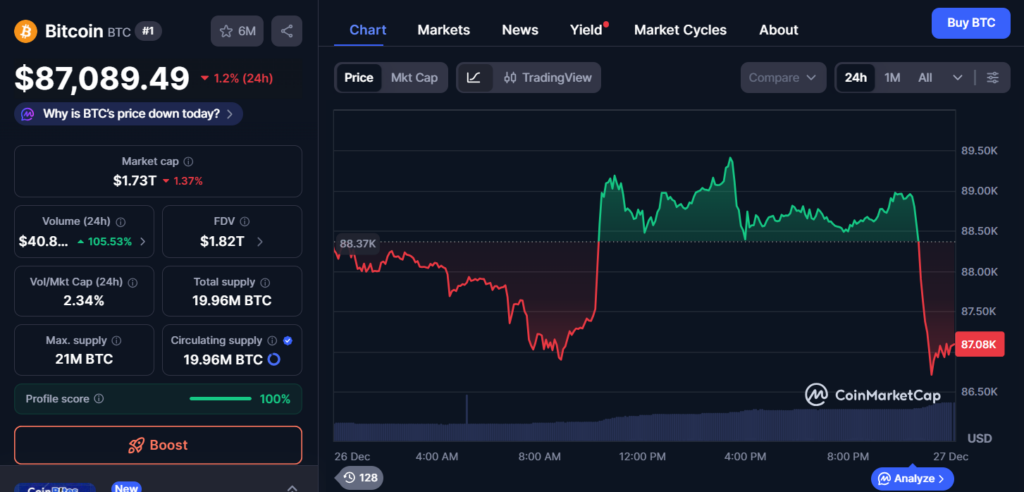 Bitcoin as soon as once more failed to carry an in a single day bounce as promoting strain returned with the opening of U.S. markets. After briefly pushing above $89,000 whereas U.S. merchants have been offline, BTC rapidly reversed course and fell again under $87,000 as American equities resumed buying and selling following the Christmas vacation.