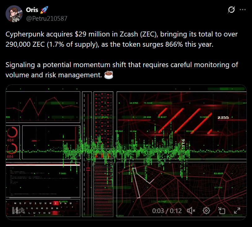 • Cypherpunk bought a further 56,418 ZEC, bringing holdings above 290,000 cash.