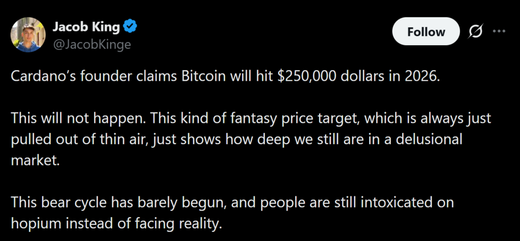 Nonetheless, critics stay unconvinced. Crypto commentator Jacob King dismissed such projections as unrealistic, arguing that markets are underestimating the depth of the present bear cycle.