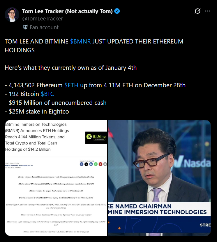 Chairman Tom Lee famous that Bitmine added almost 33,000 ETH in simply the ultimate week of 2025, a interval when most market contributors have been stepping again. Based on the corporate, that tempo makes Bitmine the most important supply of “recent cash” ETH shopping for out there proper now.