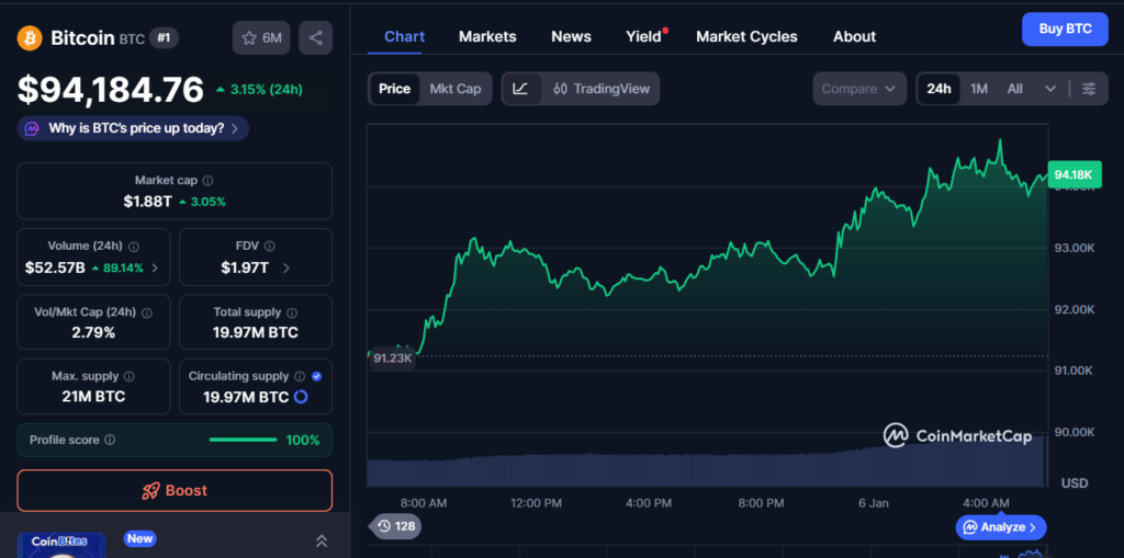 Bitcoin pushed sharply increased on Monday, blasting by the $94,000 degree after a wave of leveraged liquidations ripped by the market. CoinGlass information reveals greater than $420 million in positions have been worn out over the previous 24 hours, creating the form of pressured shopping for strain that always accelerates quick rallies. By early afternoon ET, BTC was hovering close to $94,200, marking its strongest worth degree since early December and catching many merchants off guard.