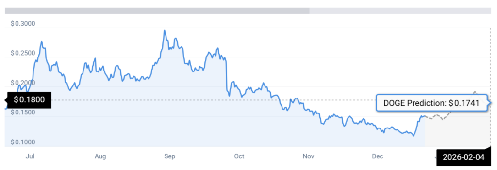 Whereas the long-term projections are dramatic, near-term knowledge paints a a lot calmer image. CoinCodex estimates Dogecoin might commerce round $0.17 by late January or early February 2026, representing a modest upside from present ranges somewhat than a parabolic breakout.