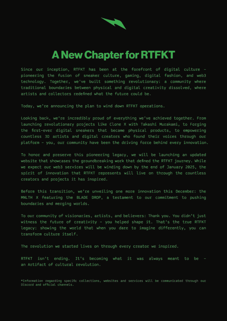 Nike acquired RTFKT in late 2021 on the peak of the NFT increase, when digital collectibles, digital sneakers, and blockchain-based branding had been drawing large consideration. At its peak, RTFKT grew to become one of the recognizable studios within the area, collaborating with outstanding artists and promoting digital sneakers that generally fetched 1000’s of {dollars}. That momentum didn’t final. In late 2024, Nike introduced it could shutter RTFKT’s operations, signaling a pullback from NFTs whereas nonetheless expressing curiosity in digital and digital experiences by gaming partnerships.