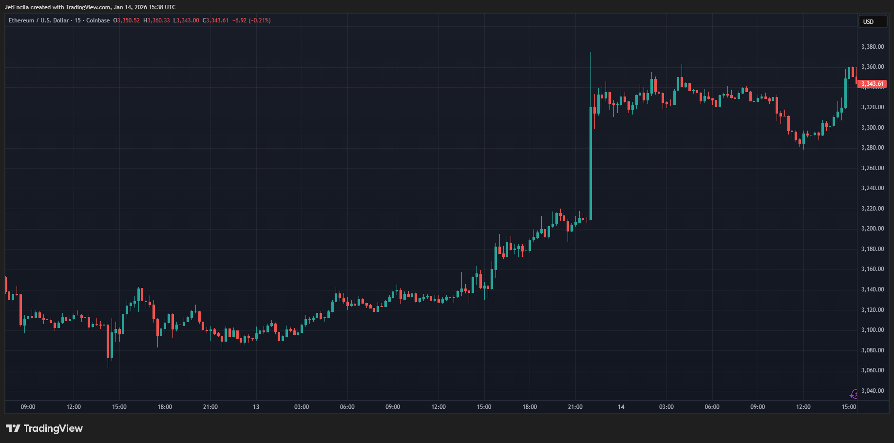 BTCUSD now buying and selling at $3,343. Chart: TradingView