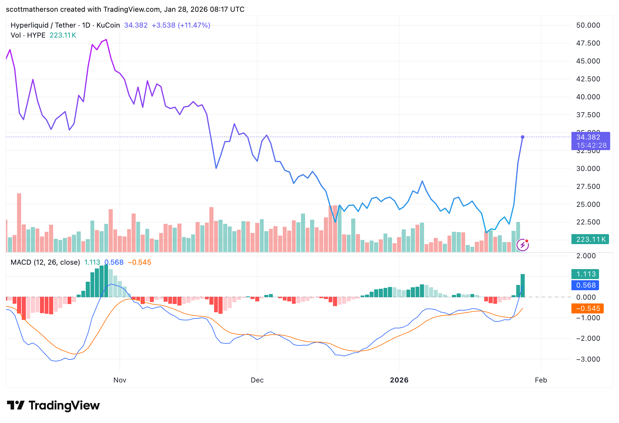 On the time of writing, the Hyperliquid value is at round $34, up over 27% within the final 24 hours, in keeping with information from CoinMarketCap.