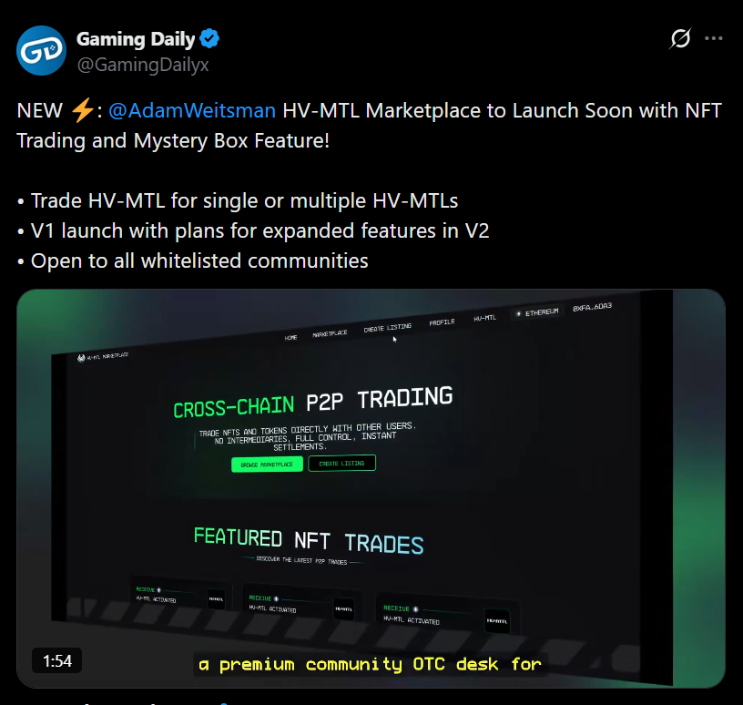 A very powerful current replace got here immediately from Adam Weitsman, who confirmed that an HV-MTL-only market is launching quickly. This isn’t simply one other place to record NFTs. Permitting HV-MTL to commerce immediately for HV-MTL, together with bundled swaps, retains liquidity and decision-making contained in the ecosystem. That shift issues as a result of it turns HV-MTL from a static collectible into an asset that may be actively repositioned, optimized, and exchanged with out relying fully on broad NFT marketplaces.
