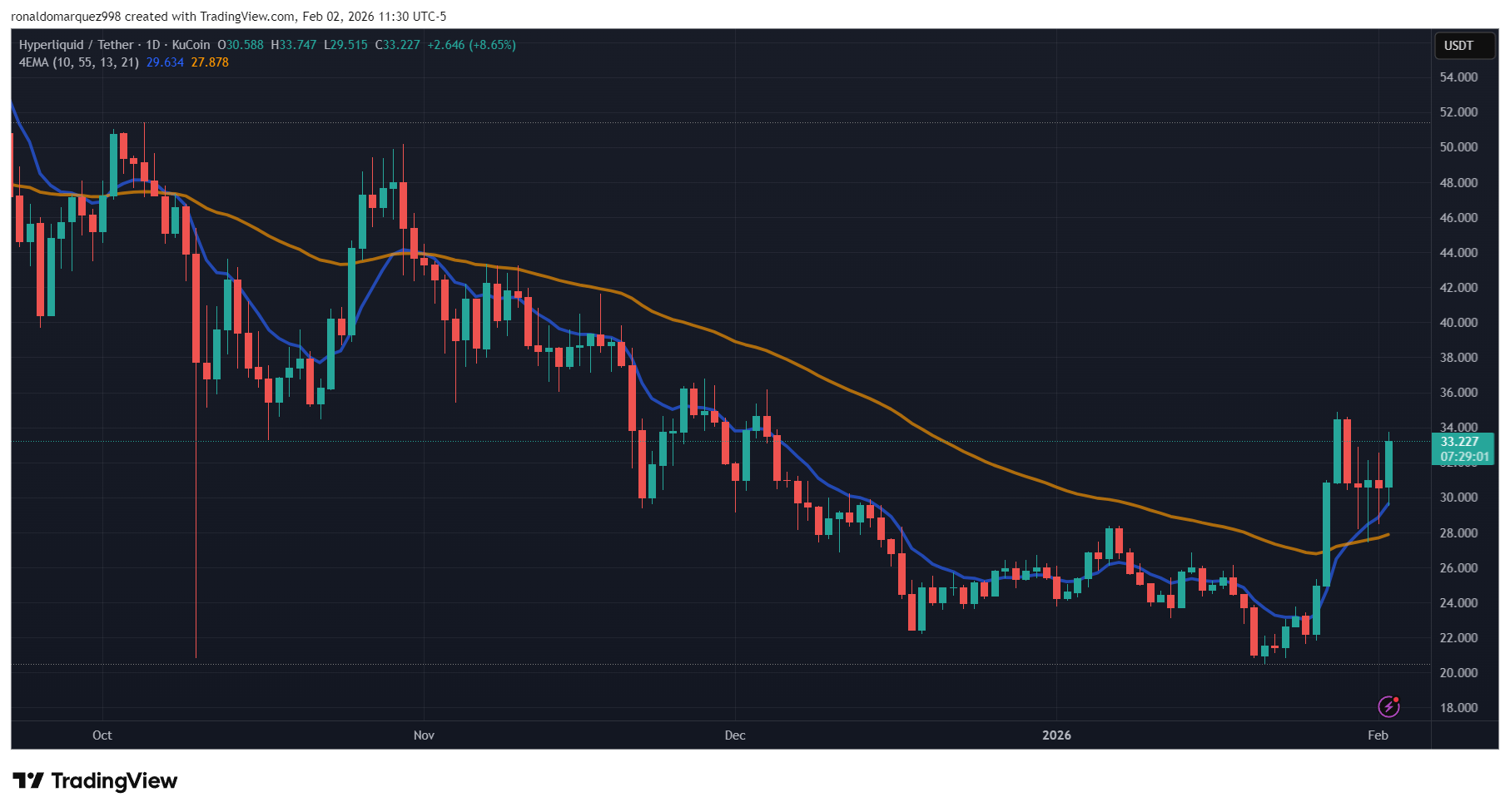 Following the information, HYPE managed to carry firmly above the psychologically necessary $30 stage and was buying and selling close to $33.22 on the time of writing. Over the previous week alone, the token has surged roughly 48%.
