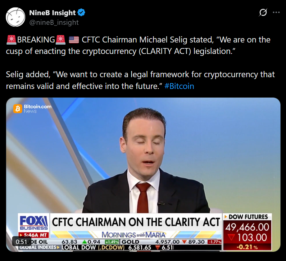 - CFTC Chair Michael Selig says crypto laws is “on the cusp”