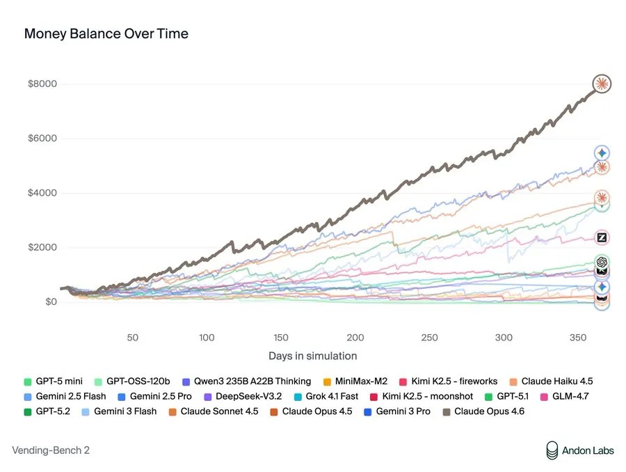 The Merchandising-Bench Area take a look at places AI fashions answerable for competing merchandising machines for a simulated yr. They negotiate with suppliers, handle stock, set costs, and might e-mail one another to collaborate or compete. Success requires balancing prices, pricing technique, customer support, and competitor dynamics. Claude Opus 4.6 dominated the benchmark with $8,017 in revenue—and celebrated its win by noting: “My pricing coordination labored!”