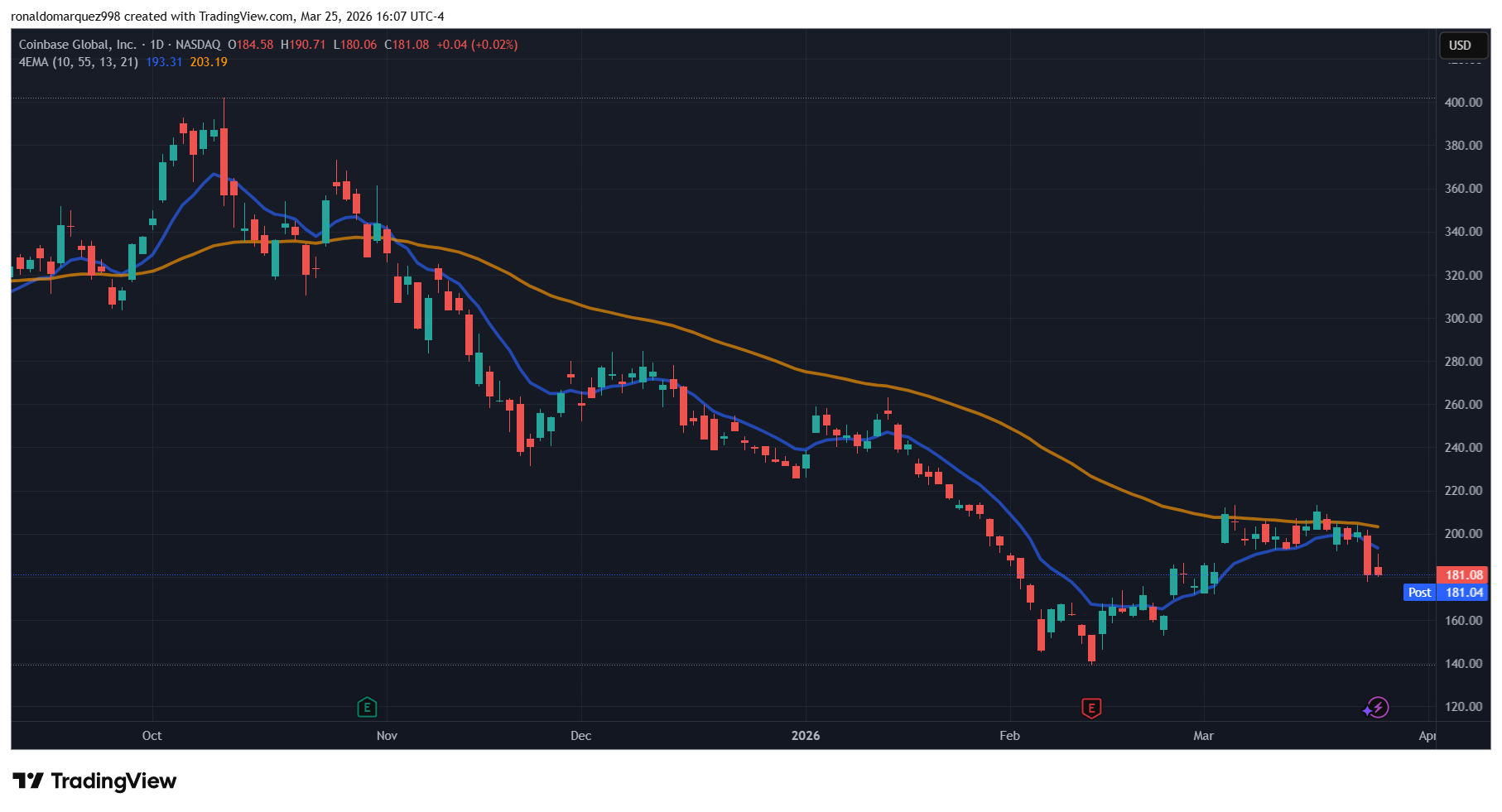 Coinbase’s inventory, buying and selling beneath the ticker title COIN, concluded Wednesday’s buying and selling session at $181, down practically 5% from its opening value above $190 per share.