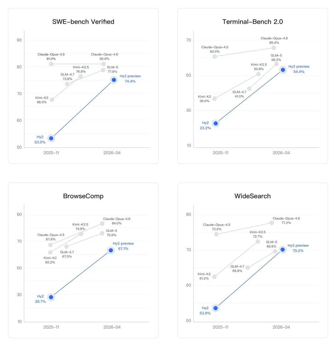 On coding, the development is dramatic. SWE-bench Verified is a benchmark that checks whether or not a mannequin can truly repair actual bugs from GitHub repositories—not toy issues, however manufacturing code. Hy2 scored 53.0%. Hy3 preview scores 74.4%. That is a 40% leap in a single era, touchdown it in vary of Claude Opus 4.6 (80.8%) and above GLM-5 (77.8%) and Kimi-K2.5 (76.8%). Terminal-Bench 2.0, which measures autonomous job execution in an actual command-line setting, went from 23.2% to 54.4%—additionally an enormous leap.