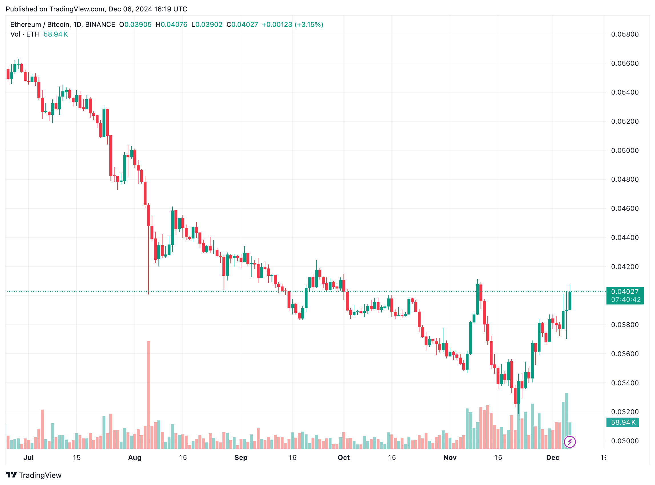 Within the ETH/BTC day by day buying and selling chart beneath, it may be seen that ETH has been making positive factors towards the highest cryptocurrency. The ETH/BTC buying and selling pair has surged from 0.032 on November 21 to 0.04 on the time of writing.